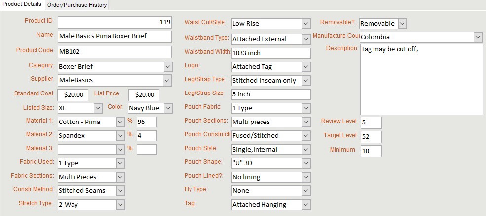 The waist is a “low-rise” cut and fit. The elastic waistband is made of a nylon microfiber material and is about 1.33-inches wide. It’s attached to the top of the underwear with multiple lines of stitching. The “MALEBASICS” Logo is on a small tag that is attached to the bottom edge of the waistband in the front, off centered above the left leg. The legs are about 5-inches in length and are hemmed around the bottom with a stitched folded inseam that is about ½-inch wide. There are also two small seams on the front-inside and rear-inside of the legs where the gusset section is used to form an inside portion of the legs. The pouch is a single-external style pouch that is formed by the contour cut of the two pieces of the fabric sewn together in the middle of the pouch from the top to the bottom. It is attached to the main body of the underwear with a seam that is sewn around the outside perimeter of the pouch. The perimeter seam has a small strip of elastic sewn inside.(Fig 5) The combination of the contour cut of the fabric, middle seam and elastic perimeter seam gives the pouch a contoured 3D “U” shape. (Fig-7) The pouch is not lined and there is no fly access. There is an attached hanging product tag the is attached to the inside-rear of the waistband with a small stitch. It appears that it could be cut off but not pulled off.