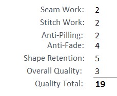 The seam and stitch work lack a little quality control and appear the be done in a rush. There seams lines are a little irregular and the stitching uneven. There are spots where the fabrics edges stick out of the seam work and places where the stitching skipped or missed. There were several loose or hanging threads. There is a little pilling especially where the fabric rubs on outer clothing, like at the front of the pouch and gusset area. The fabric has faded just a tad since removal from the box. The boxer brief has retained its original shape with no areas of fabric distortion.