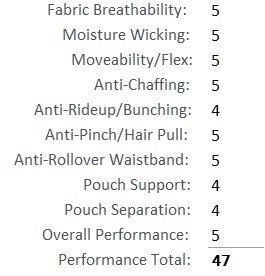 The fabric is very breathable and moisture wicking, especially the “Cool” and “Glide” zones. The added spandex in the fabric and elastic bands in the seam work, gives this underwear very flexible properties that move nicely with the body. I have not experienced any chaffing or rub points. No hair pulling or pinching. There was a little ride up in the legs but that is usually expected in underwear with any leg length as I get thrashed around in the seat of my equipment. The pouch does provide good support and separation for a boxer brief, so there is a little lift with a minimal bulge effect. Great performance overall.