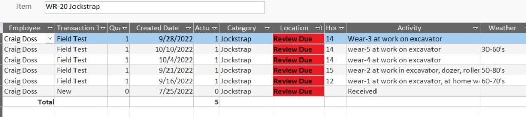 The WR20 Jockstrap has been out on the range 5 times with about 69 hours of wear time. Most of the wear time was at work operating heavy equipment. The jockstrap has been through 5 laundry cycles.