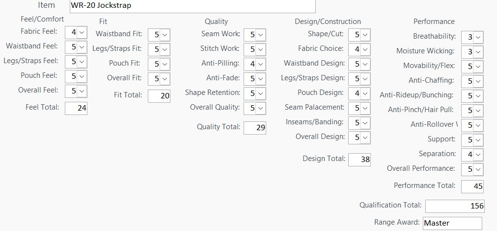 The WR20 fits very well and in accordance with the sizing guide on the site. The waistband stays put with enough elasticity to prevent gapping. There is not rollover or twisting and no need to pullup or adjust. With the larger 3D contoured shaped pouch along with the elasticity of the seams gives this jockstrap a snug and supportive wear that carries the genitals in a more anatomical fit. The leg straps are also fit well and stay snug without any sagging, gaps or twisting. The wide width of the straps didn’t cut in.