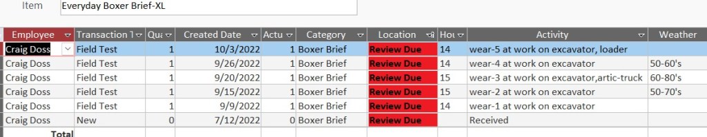 The Everyday Boxer Brief has been on the testing range 5 times with about 66.5 hours of wear. This was mostly at work operating heavy equipment and the daily commute ride. They have been through the laundry cycle 5 times.