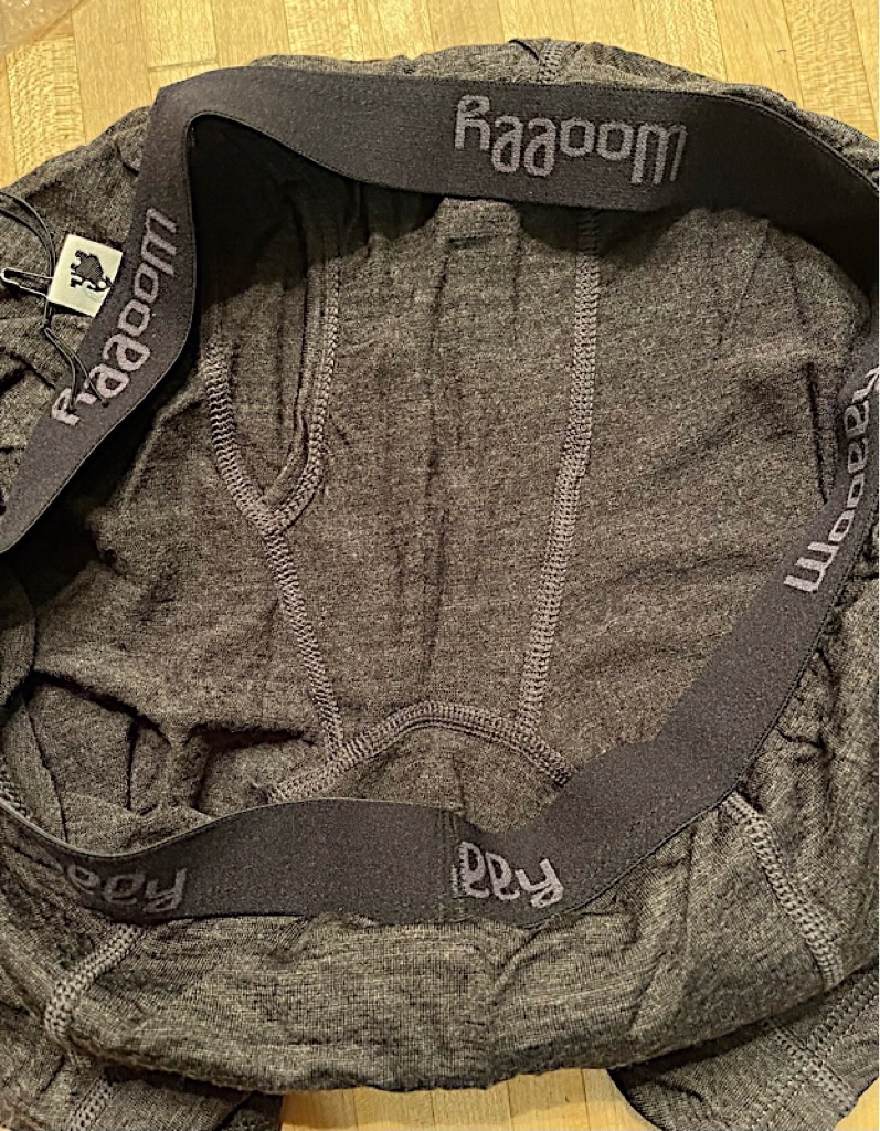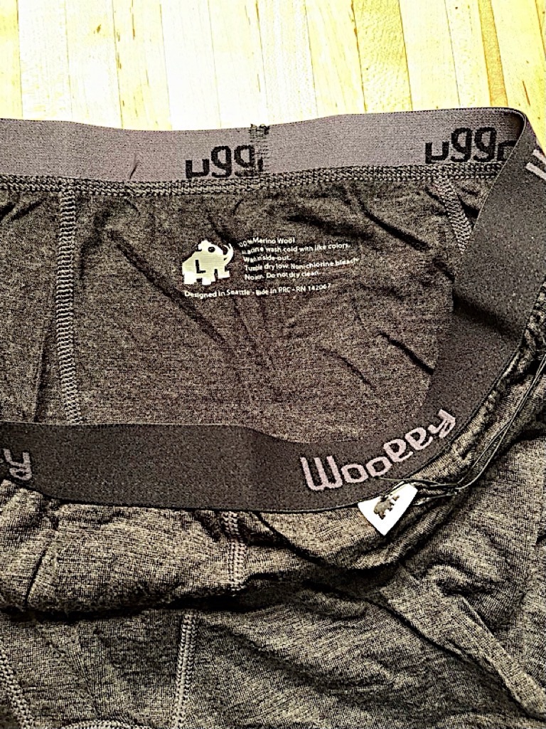 The waistband is made from one piece of elastic banding that is about 1.25-inches wide. It is joined in the center rear with an end-to-end stitched seam. The band is attached to the fabric with multi lines of stitching. The waistband also seams to have a felt like finish on both sides. The “Woolly” logo is embroidered in the waistband and there is also a small tag with the little Woolly mammoth image that is attached to the front outside of the waistband. The product information is imprinted on the inside rear of the fabric.