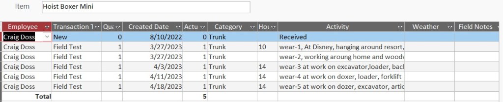 The Hoist Boxer Mini has been out on the testing range at least 5 times for about 66 total hours of wear. Most of the wear was while I was on the job operating several different pieces heavy equipment. Some doing different task around home and my shop. Some while on vacation at Disney enjoying many rides and walking.