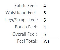 The cotton fabric is very soft on the skin and all the important parts is covers. The waistband is soft and smooth with a velvet like lining material on the inside of the waistband that is against the skin. The high hip cut of the legs have an open and free feel. Overall, the underwear feels soft, light, and comfortable under outer clothing.